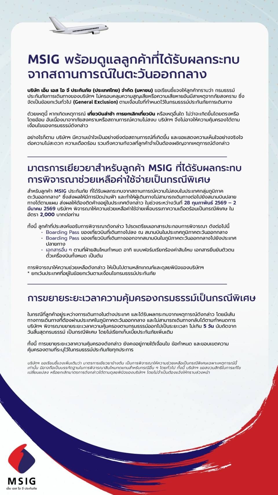 มาตรการดูแลลูกค้าประกันเดินทาง MSIG ที่ได้รับผลกระทบจากสถานการณ์ในตะวันออกกลาง